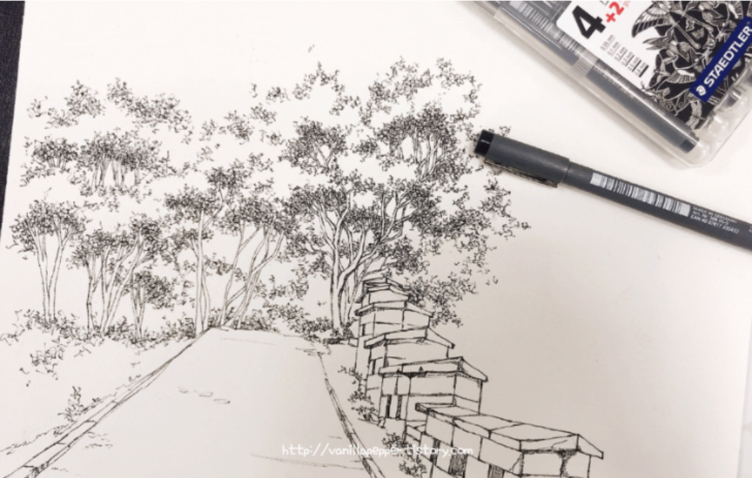 ▶ 펜으로 명암을 표현하는 것은 연필로 명암을 표현하는 것보다 조금 어렵습니다. 하지만 몇 가지 팁을 익히고 연습을 해보면 감을 잡을 수 있고 연필에 비해 선명한 펜터치가 색다른 펜 드로잉의 매력을 느낄 수 있습니다.